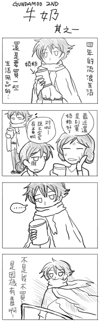 (自認為對剎那的身高怨念很重XD)第一篇是應映時事,但其實剎那可以買鮮奶喝呀XD第二篇是看到預告兩人的對話沙慈竟然比剎那高阿阿阿 (失望....)剎那注定要當meister裡最矮的嗎....(跟提耶差怨恨的2公分啊!!)最後 有沒有人看完第一集後被剎那和沙慈萌到的!!!